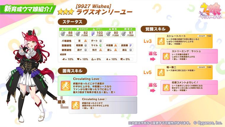 ウマ娘 ラヴズオンリーユーの考察と育成法キャラクター考察 主な性能と運用 特徴 詳細 適性 芝(高い)、中距離(A)、マイル(C) 脚質 差しが推奨(スキルと相…