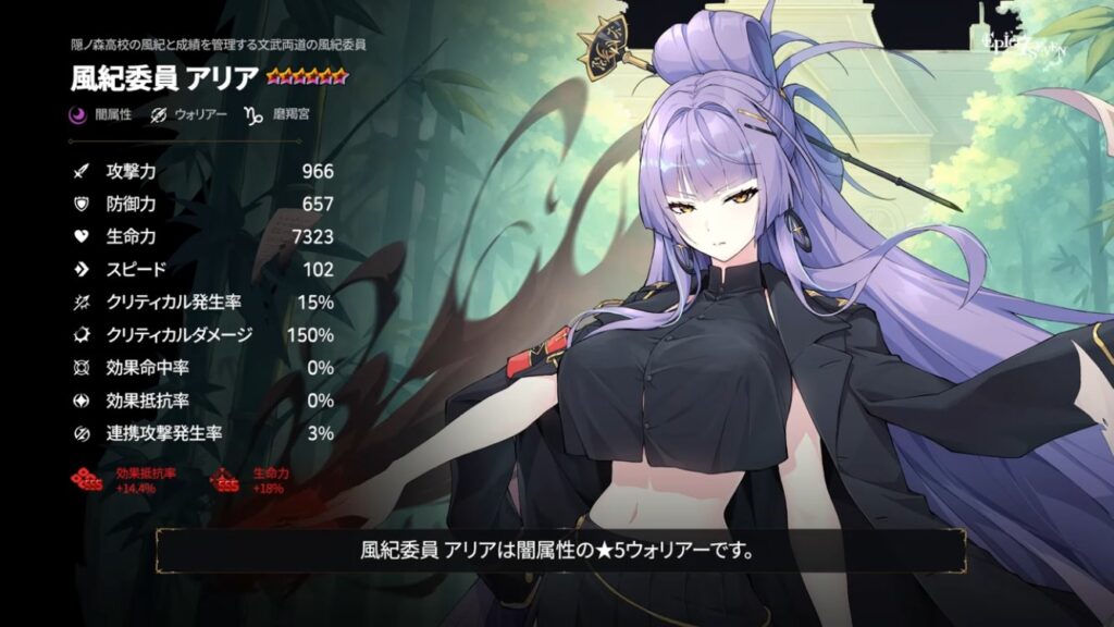 エピックセブン「風紀委員 アリア」の考察と育成法エピックセブンの「風紀委員アリア」(通称:闇アリア)の考察と育成法について整理しました。 風紀委員アリアの特徴・性能 主…